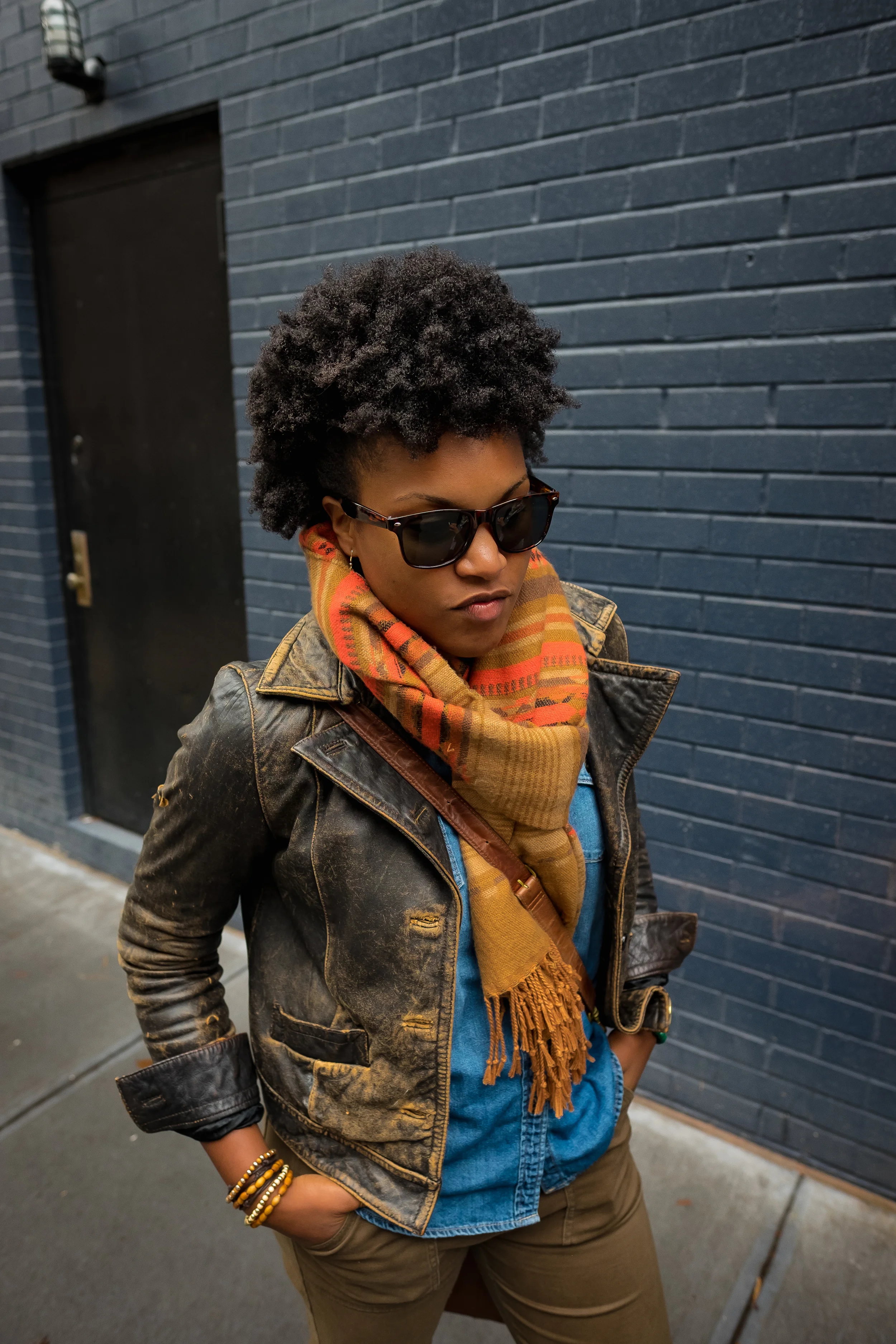 I had been looking forward to an opportunity to capture her cool. That quite confidence she exudes, bolstered by the humility of a person that understands the world for what it is. While visiting us for the holidays, we came into the city so she could catch up with some friends. While my fiancé returned the rental she got for the holiday hustle, we walked across the street to get out of the way & wait for her to finish her business. I noticed this cool gray wall as we hung out, talking as we do, cracking jokes, while politicking about possibilities & realities. This was it, the moment. I drew my camera from my bag & let it happen.